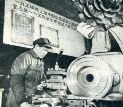 上海机床厂的车工盛利已经跨进了第二个5年计划的大门。在2年10个月中,他改进了39种工具、夹具和操作方法,生产效率提高1倍到5倍。现在他已提出了在第一个5年计划期间内完成8年工作量的计划。