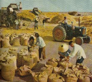 五河位于淮河下游,是浍河、沱河、和潼河的汇口处,河多湖多,地形低洼。从前的五河县是:“五河五道河,河多灾害多,有雨泛洪水,无雨禾着火,弃儿又卖女,乞讨度日过。”而现在的五河则是:五河五道河,河多幸福多,鸭鹅鱼满塘,稻麦闪金波,丰衣又足食,遍地幸福歌。”图为新集公社在庆丰收。(1960年)