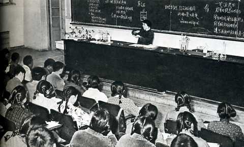 把加强基础课教学作为提高教学质量的重要措施之一,图为化学系学生在实验室作普通化学基础课实验。