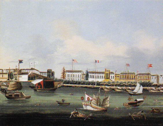 油画《广州珠江河畔》(42.5x75厘米)约1850年。江畔都是美、英、荷兰的公司大楼。