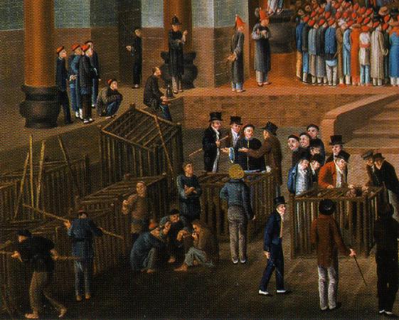 《审判海盗》(局部)。洋行的商人在议论纷纷。