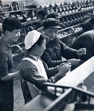 中国人民解放军贵州省军区副政委、贵州省革命委员会主任委员李再含同志在棉纺厂和工人一起劳动,共同研究解决革命与生产中的问题。
