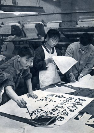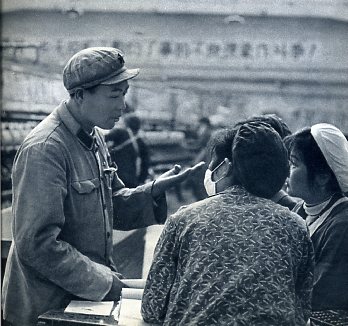 解放军同志来到车间,和工人一起商量革命和生产问题。