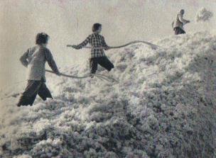 红旗人民公社的925亩棉田平均亩产900斤籽棉,收摘的棉花堆积如山。(1958年)