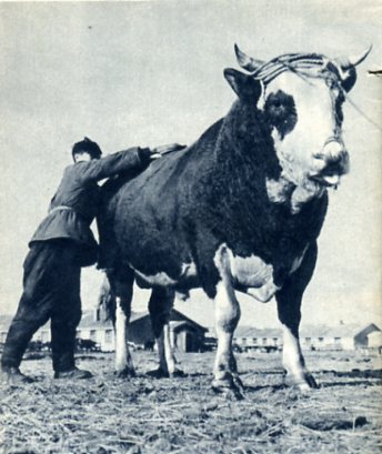 内蒙古自治区呼伦贝尔盟谢尔塔拉国营种牛场是培育三河牛的基地之一。这种牛体格高大,四肢精壮,性情温柔,产奶量也高。(1959年)