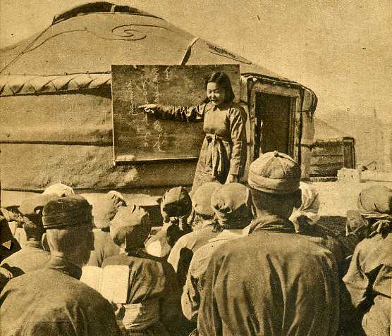 除正规学校外,自治区各级人民政府还举办了许多冬学和识字班。上图是察哈尔盟正白旗高叫营的牧民在上课。