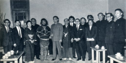 周恩来总理五月六日观看了日本话剧团演出的日本历史剧《郡上农民起义》。接见了日本话剧团团长泷泽修(前左四)、副团长东野英治郎(前左六)、副团长兼秘书长杉村春子(前左三),导演、日本话剧团顾问团长村山知义(前左七),编剧小林宏(后左二)等。