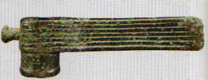 (商)戚。弦纹式,14.5厘米,大红旗村出土。这种近于钺斧形的武器,有銎孔用以巩固柄部,效果明显优于商周时期的戈、钺。