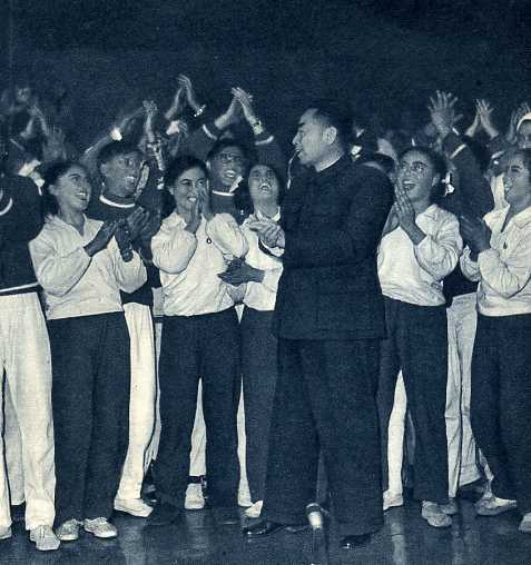 我校学生于1959年在中国人民政治协商会议礼堂举行汇报演出。这是周恩来总理在演出后接见我校学生演员。