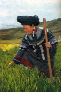 1958年凉山农业大丰收,每人平均能分到粮食800斤。今年,农民生产的劲头更高了,男女青年正在麦田里进行管理。