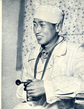 全国农业劳动模范土比阿列。去年,他种的水稻试验田,每亩收了896斤。解放前,这里的水稻亩产只有七、八十斤。
