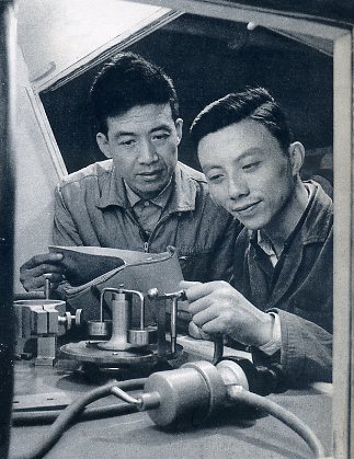 原棉纺厂工程师闵周(右)设计制造了二十六种测试仪器。现在他又和工具车间老工人顾本琦一起研究改进检查仪。