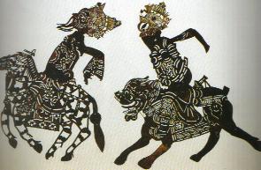 孝义纸窗影戏《封神榜》人物。黄飞虎(骑马)、崇黑虎(骑狮)。
