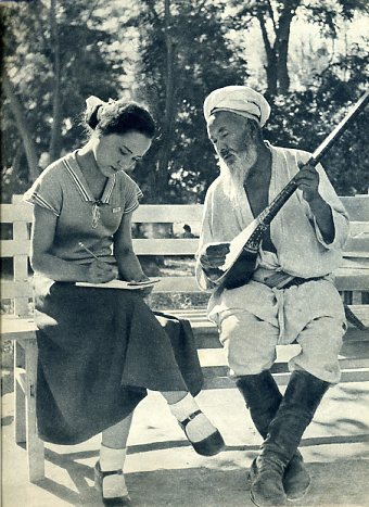 维吾尔族音乐舞蹈工作者沙里曼•乌拉卓娃在记录民间艺人牙生吐尔德唱的歌曲。