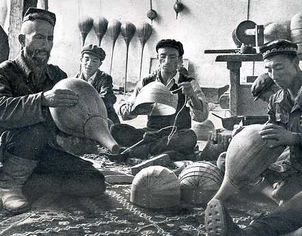 新成立手工业合作社、集中了喀什市的手工艺工人,制造帽子、乐器、绣花衣服。图为花帽车间。