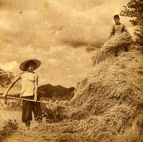 社员们按劳力强弱和特长进行合理的分工。这两个妇女正在晒谷场上进行翻稻粒的工作。