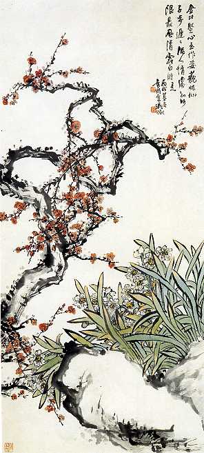 纸本设色《梅花水仙》(107x48cm)1946年 中国美术馆藏