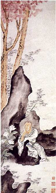 纸本设色《看花古佛图轴》(110.7x30.3cm)唐云大石斋藏