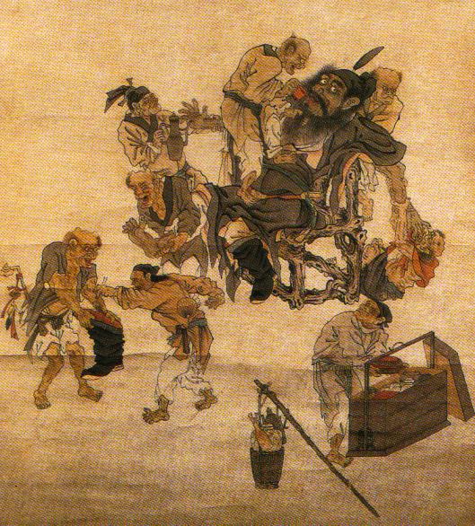 罗聘曾画《鬼趣图》多卷。此图写钟馗因好饮而醉倒椅上,任众鬼为之,无力斩杀。鬼类得意忘形,有的用酒灌钟馗,有的将毒蝎子放入他的靴中......。