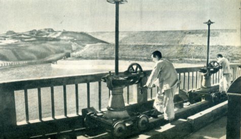 五年计划规定在淮河修建4个大型水库,共可蓄水38亿立方公尺以上。这是修建中的梅山水库连拱坝。