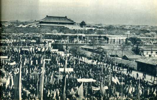 5月1日,北京10万人民举行盛大集会,庆祝国际劳动节。在天安门检阅台上的是(自左至右):龙云、张治中、张鼎丞、赛福鼎、贺龙、邓子恢、邓小平、彭德怀、陈云、朱德、毛泽东、刘少奇、董必武。
