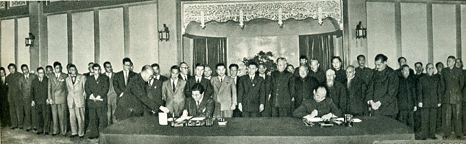 中华人民共和国全国人民代表大会常务委员会秘书长彭真和日本国会议员访华代表团团长上林山荣吉根据毛泽东主席接见代表团时双方交换意见的结果,就中日友好亲善、和平、邦交正常化、中日贸易等7项问题取得一致意见,于10月17日发表联合公报。在公报上签字的是上林山荣吉团长(左)和彭真秘书长。