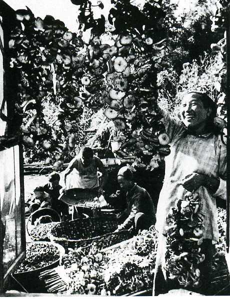 允许社员经营小规模的家庭副业后,养猪、编织、渔猎、采集等生产活动得以开展。图为公社社员在晾晒采集来的山货。