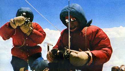 登山队员在珠穆朗玛峰顶拍摄电影。