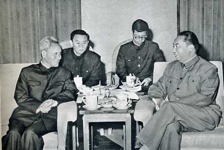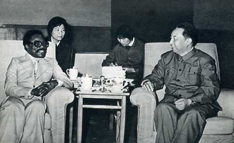 中共中央主席、国务院总理华国锋。一九七六年十二月二十二日会见了阿拉伯也门共和国指挥委员会主席兼武装部队总司令易卜拉欣•穆罕默德•哈姆迪中校。