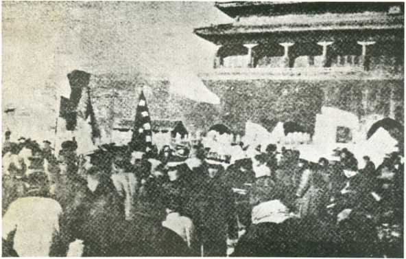 1924年12月31日,孙中山抵达北京,在天安门前受到十万群众和学生的欢迎。
