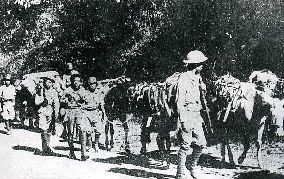 1941年12月底,中国组成远征军,次年3月入缅作战。4月中旬,日军侵占缅甸北部的仁安羌,英军被困,中国远征军一部驰援,激战两昼夜,克复仁安羌,解救了7,000余名英军和数百名记者、教士。图为获救英军与中国军队会合后退入印度。